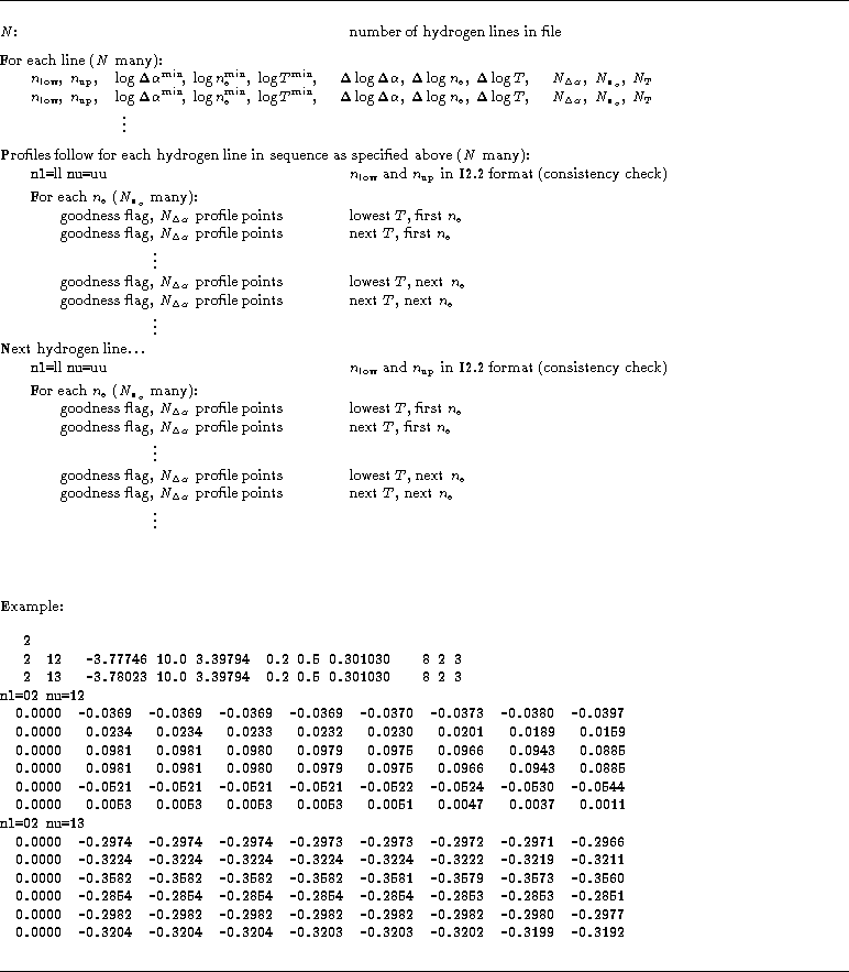 The pure Stark profiles and the broadened profiles are given in separate files. The file layout is given in Table 1 (click here) and a minimal Fortran illustration for how to read it is given in Table 2 (click here).