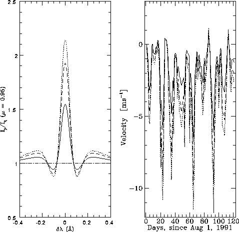 In Fig. 6 (click here), we show the sensitivity of the simulation to a variation in strength of the plage contrast. An inspection of Fig. 1 in Ulrich et al. (1993) indicates that our synthetic plage contrast is smaller than the observed one by a factor up to 1.7 at the cell working points. An underestimate of the plage contrast and areas partly explains the value of 3.6 of our saturation factor. We ran a number of simulations with increasing plage contrasts; the results show again that peaks and dips of the simulated signal are emphasized with respect to the result with standard contrast, but their locations and shapes are substantially unmodified.