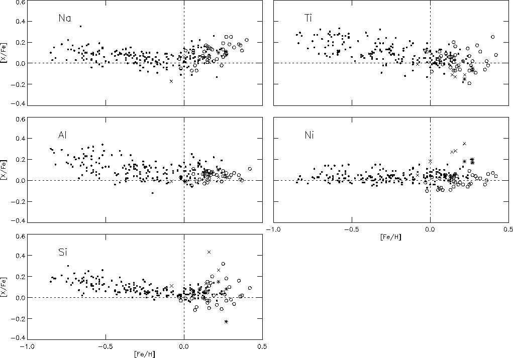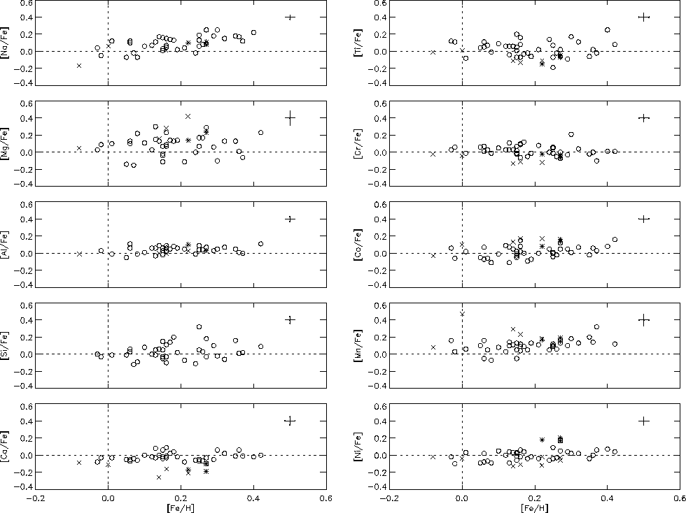 We have used 12 lines from the nickel atom to obtain abundances; Edvardsson et al. (1993a) used 20 lines. Like Edvardsson et al. (1993a) we find that nickel varies in lock-step with iron, and this continues also for higher metallicities, Fig. 14. For the stars in common between the studies the nickel abundances derived are in excellent agreement, although our study does not show the slight offset found by Edvardsson et al. (1993a).