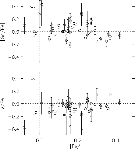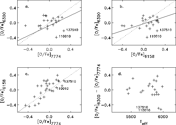 Edvardsson et al. (1993a) found a correlation between oxygen abundances derived from the [OI] line and the abundances derived from the triplet lines as well as a correlation with the abundance derived from the 6158 Å line. These relations are shown, together with our data, in Fig. 11. We do not find a clear correlation between abundances derived from [OI] and the abundances derived from the 7774 Å triplet and 6158 Å lines for our stars. This circumstance, and the fact that the [OI] line is not expected to be affected by departures from LTE, lead us to use only the abundance derived from the [OI] line in our analysis.