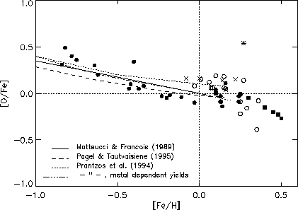 In observational studies of galactic chemical evolution iron is often used as the reference element. The reason for this is twofold; iron is believed, but this is debated, to be a fair chronometer for the nucleosynthesis in the Galaxy, and the spectra of dwarf stars show many iron lines, easy to measure. The evolutionary picture for iron is complicated by the fact that iron is produced in both core collapse and type Ia supernovae. From this point of view oxygen, which is only produced in core-collapse supernovae, may be preferable as reference element. However, as we will discuss in Sect. 6.2 (click here), oxygen abundances are not trivial to derive. We will therefore conform with common practise and use iron as reference element.