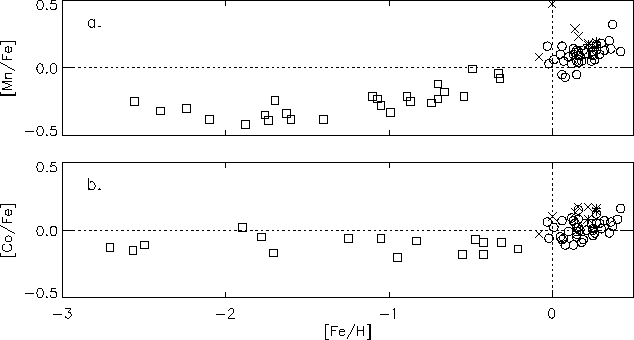 Manganese and cobalt belong to the group of iron-peak elements. These elements are thought to be formed during explosive silicon burning in supernova explosions and nuclear statistical equilibrium (Woosley & Weaver 1995).