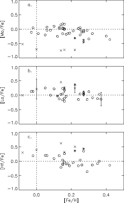 In conclusion, the abundances of Mo, La, and Hf seem to roughly vary in lock-step with Fe, however, with some indications that the abundance ratios decrease with increasing [Fe/H].