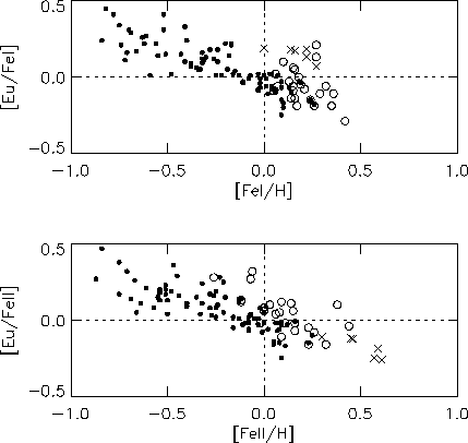 In Fig. 25 (click here) data from Woolf et al. (1995) and our data are plotted with iron abundances derived from FeI and FeII as reference, respectively. Europium shows a declining trend with metallicity from [Fe/H] = -1.0 to 0.0 dex and this trend now seems to continue unchanged for [Fe/H] > 0.0 dex.