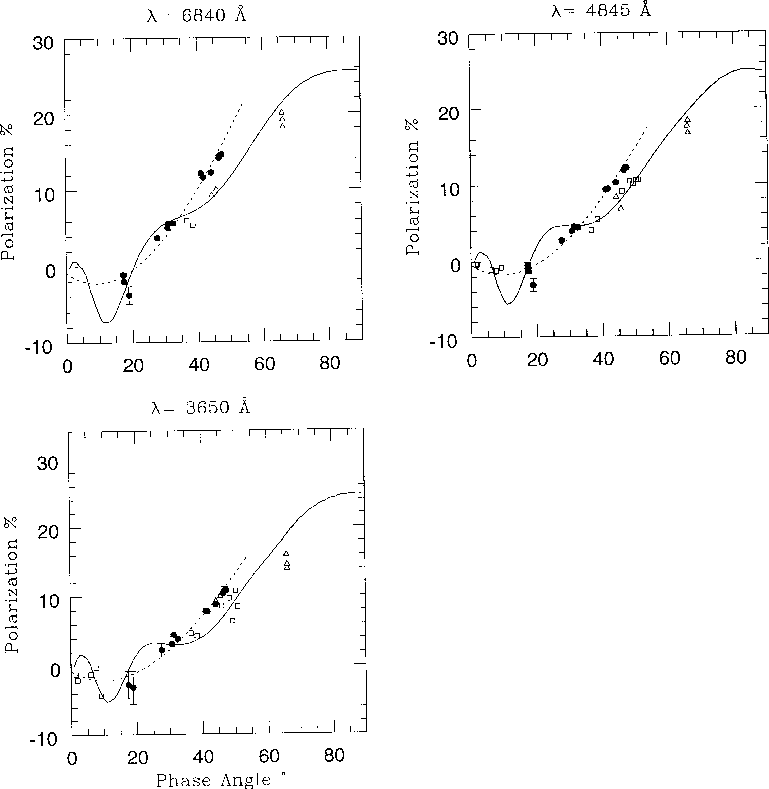 Figure 2 (click here) displays the wavelength dependence of polarization at different phase angles. Shown with a dotted line is the wavelength dependence of Comet Halley (Kikuchi et al. 1987) for one phase angle. This figure shows that continuum polarization in Comet Hale-Bopp has a very strong wavelength dependence. The degree of polarization increases with increasing wavelength which is a marked difference from Comet Halley whose wavelength dependence is more flatter. This wavelength dependence is found to increase with increasing phase angles. This is expected for smaller (compared to Halley) sized dust grains.