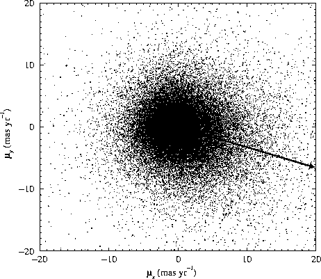 The final catalogue (Table 6, available only in electronic form) contains a total number of 51846 stars, all of them having positional information. 39762 stars have standard photographic photometry too (Sect. 3.1). A total number of 12029 stars do not have standard photometry, because they were not detected in the blue photometric plate, and no colour term could be applied. For these stars, the raw R magnitude (Sect. 3.3) computed from the master plate was included in the catalogue as brightness indicator. 55 stars do not have standard nor raw photometry, for being too bright: they are labelled with R=0 in the catalogue. Proper motions were computed for 45036 stars, 37129 of them using three or more different plates (31257 stars having complete standard photographic photometry). As said in Sect. 4.2, proper motions were computed provided plates span a minimum of 30 years. The catalogue contains, for each star, the following data: an identification number (that assigned in MAMA original files to the objects in the master plate), the coordinates in the master plate reference system, the proper motions with their standard errors, and the BVR photographic photometry. Cross-identifications with the most widespread star catalogues and with previous studies of the zone (Cuffey 1937; Straizys et al. 1992, Paper I) are given in notes to Table 6. Figure 10 represents the vector point diagram (VPD) of the whole set of relative proper motions. The elongation in the VPD due to the solar motion is evident.