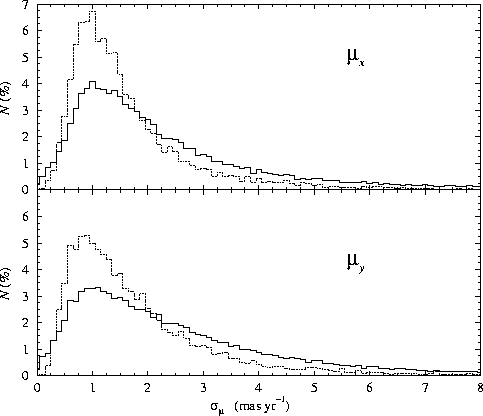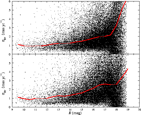 As could be expected, the internal errors are strongly dependent on the number of plates used for the calculation. Table 8 displays the average error of proper motions as a function of the number of plates. There is no clear tendency of the errors as a function of the distance to the master plate center, nor for the whole sample, nor for the brightest stars (R<16 mag). Figure 12 displays the histogram of the error distribution for the whole sample, and for the stars brighter than R=16 mag.