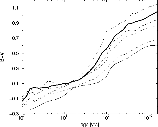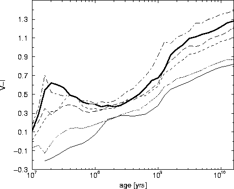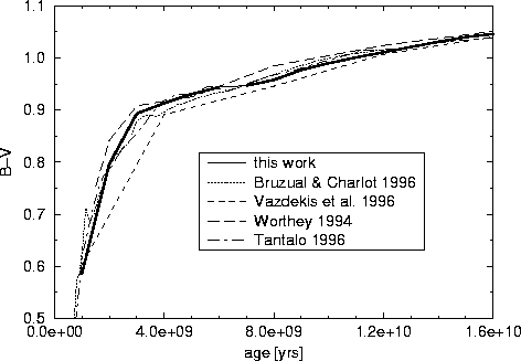 Our B-V - colours are very close to those of the BC96 models. This is surprising since they also calibrated their colours with the library from Lejeune. The models from Vazdekis et al. are bluer at all times. They use a different empirical calibration. The B-V - colours for all models seem to converge at high ages.