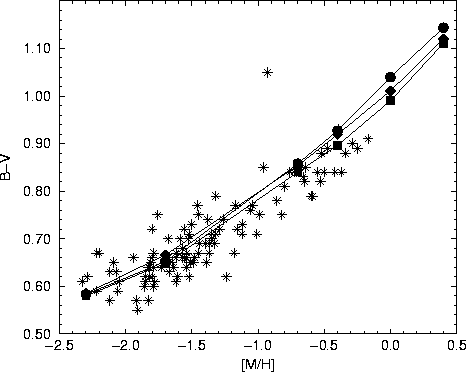 In Figs. 3 and 4 the colours B-V and V-I are shown as a function of metallicity for the models at evolutionary ages of 10, 12 and 15 Gyr together with colors of dereddened GCs from the McMaster catalogue (Harris 1996). In general, we see a good agreement between the models and the observed clusters. The large spread in colour in the observed clusters probably arises from observational errors.