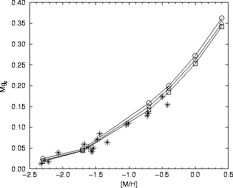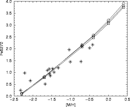 In Figs. 5 and 6 we plot against metallicity the indices Mg2 and Fe5270 from our models and those of Galactic clusters from Burstein (1984). The agreement of the models with the observations is very good over the metalicity range covered by the data. Model calibrations of both Mg2 and Fe5270 as functions of metallicity are almost independent of age for ages close to a Hubble time.