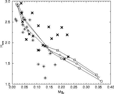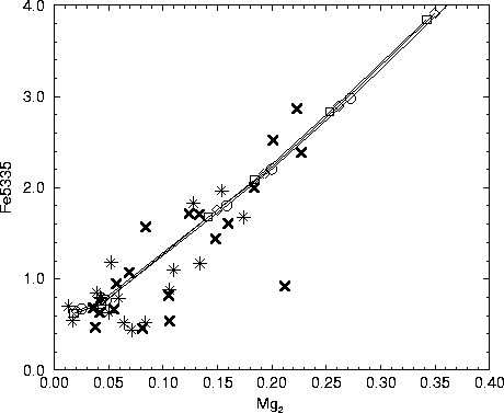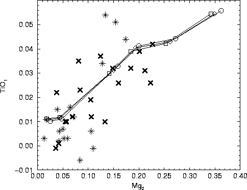 The Fe5335 and TiO1 are plotted against Mg2 for observations from Burstein in Figs. 8 and 9 respectively. Both the relations between the Fe5335 and TiO1 indices and Mg2 are virtually independent of model age for ages close to a Hubble time.