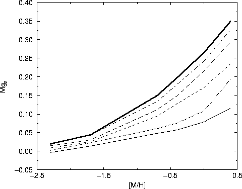 Figure 10: The Mg2 index against metallicity for various ages. Thin solid line: 0.5 Gyrs, dotted line: 1 Gyr, dashed: 2 Gyrs, long dashed: 4 Gyrs, dot dashed: 8 Gyrs, thick solid line: 12 Gyrs |