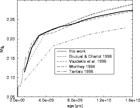Figure 12: Comparison of the Mg2 index against age as predicted with our models to those of other authors |