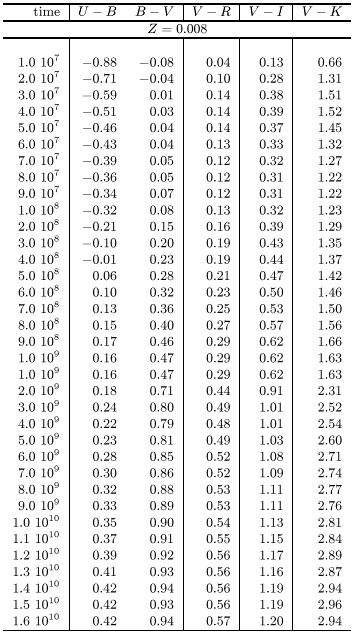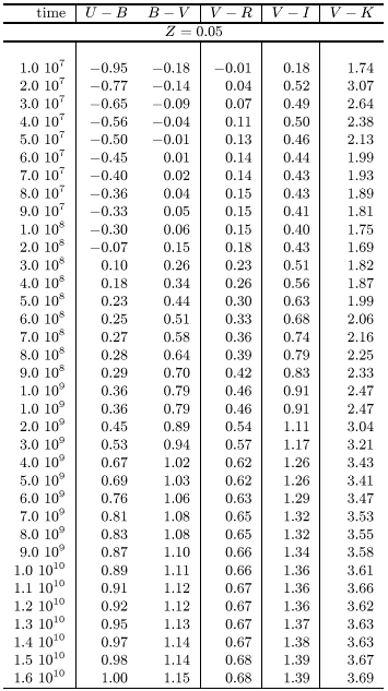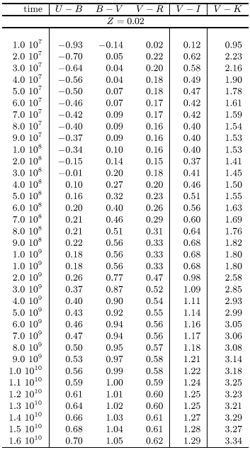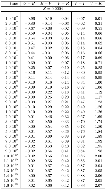Figures 1 and 2 show the evolution of B-V and V-I versus time of our SSPs on a logaritmic time scale for all metallicities. After a few Gyrs the changes in both colours become very slow, and the metallicity dependence becomes more important. Tables 1 through 3 give the time evolution of all our broad band colours from U to K for 6 metallicities from Z=0.0001 to Z=0.05 for a wide range of ages.