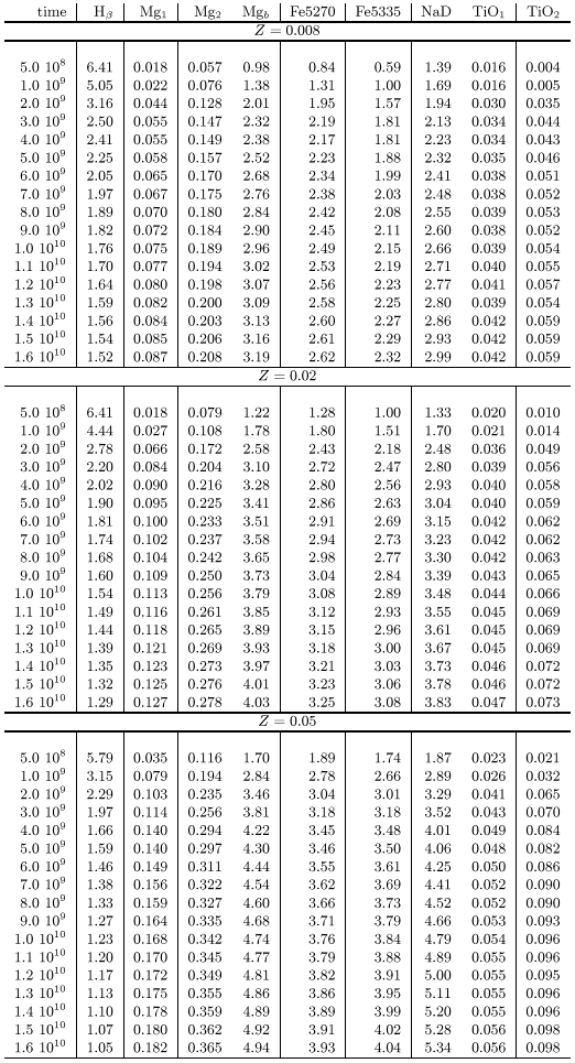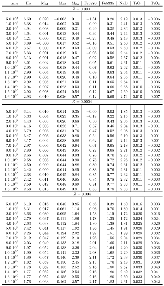In Fig. 10 we show the model index Mg2 against metallicity for a wide range of ages from 0.5 to 12 Gyrs.