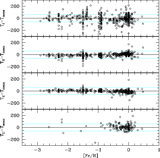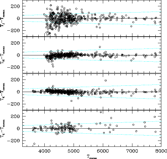 We show in Figs. 5 and 6 the difference between TJ, TH, TK and TL', and the average temperature adopted. The individual