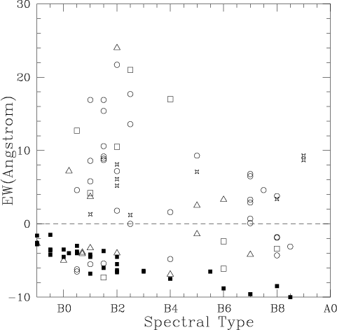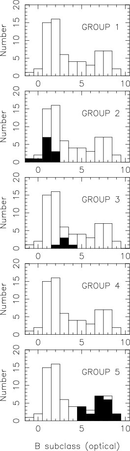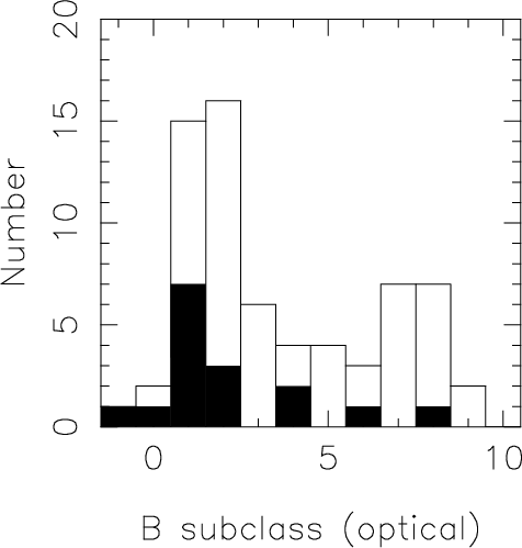 Figure 3: Histogram showing the number of stars which have undergone a phase change (solid areas) and the total distribution of stars as a function of spectral type (hollow plus solid areas) |