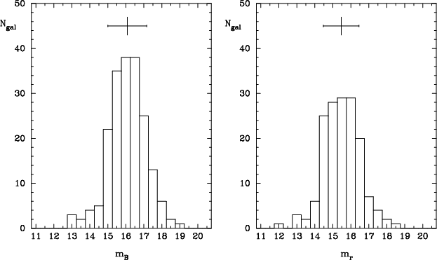 Figure 1: Johnson B and Gunn r histograms of the UCM Survey. The top error bar shows the average and the standard deviation of the data (see text). The average colour results 0.71 magnitudes. The Gunn rdata have been extracted from Vitores et al. ([1996a]) |