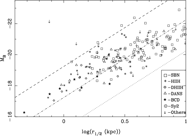 We plot the absolute total magnitudes versus the effective radii of the UCM galaxies in Fig. 2. Galaxies were labelled depending of their spectroscopic type (see Gallego et al. [1996] for details):