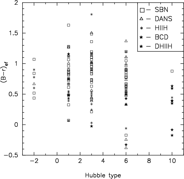 more relevant in BCD and DHIIH galaxies, making them bluer. In