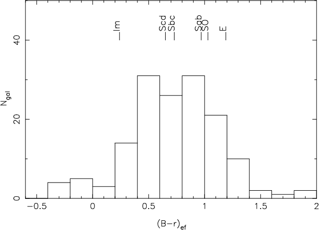Figure 5: B-r histogram of the UCM Survey Lists I and II. The averaged colours of Fukugita et al. ([1995]) have been marked at the top |
