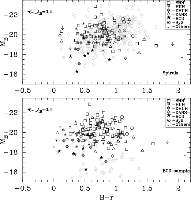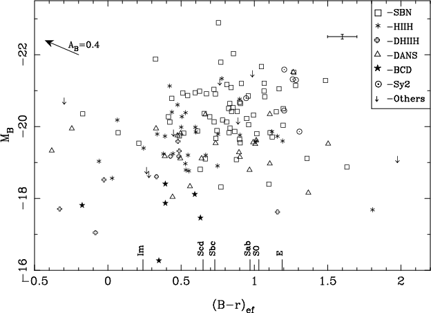 The UCM Survey does not contain objects brighter than an absolute magnitude of -22.9 or fainter than -16.3. Despite the considerable scatter, we observe a correlation between MB, r1/2 and the spectroscopic type in Fig. 2. BCD galaxies appear as small and faint objects in the bottom left corner of the plot. SBN galaxies are more concentrated in the largest effective radius and luminosity zone of the diagram. This should be the place for normal grand-design spirals. The existence of a bright starburst in the nucleus of SBN objects turns them into objects redder than those with the starburst located out of the nucleus (see below the discussion of Figs. 4 and 6). Only UCM 1612+1308 shows the typical small size of nucleated compact dwarfs. Most of the DANS and HIIH galaxies are also located in the small effective radii zone, below 5 kpc.